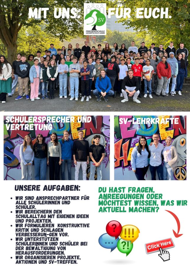Die SV an der Friedensschule bringt sich auf vielen Wegen aktiv ins Schulleben ein. Unten findet Ihr unsere letzten Aktionen. Ihr erreicht uns per E-Mail unter schuelervertretung(at)friedensschule-hamm.de (bitte das (at) durch ein @ ersetzen).
